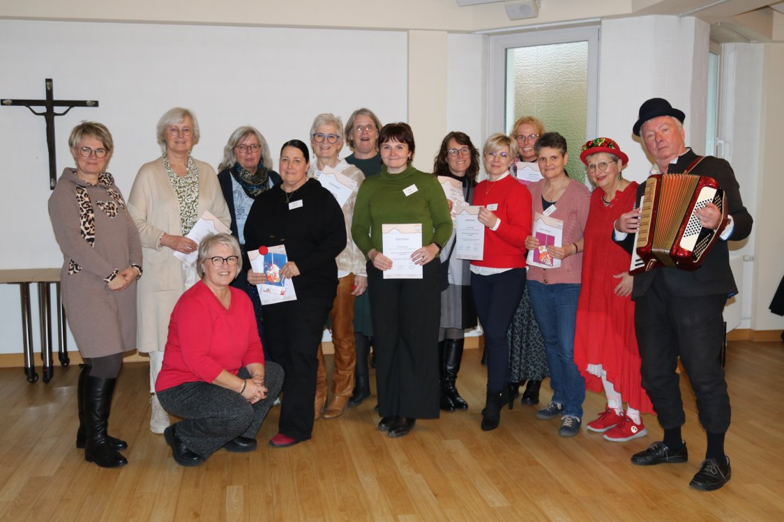 Die Teilnehmer und Koodinatoren freuen sich über den erfolgreichen Kursus: (von links) Alicja Bönning (Koordinatorin), Christa Ahrens, Silke Antemann (Koordinatorin), Silvia Drüke (Koordinatorin), Susanne Struck, Veronika Backhausen, Annett Winklmair, Anna Kerbs, Helena Neumann, Nina Wall, Sabine Kleine, Gabriele Auth, Hildegard Ebe und Heiko Grosche (Kontaktclowns)